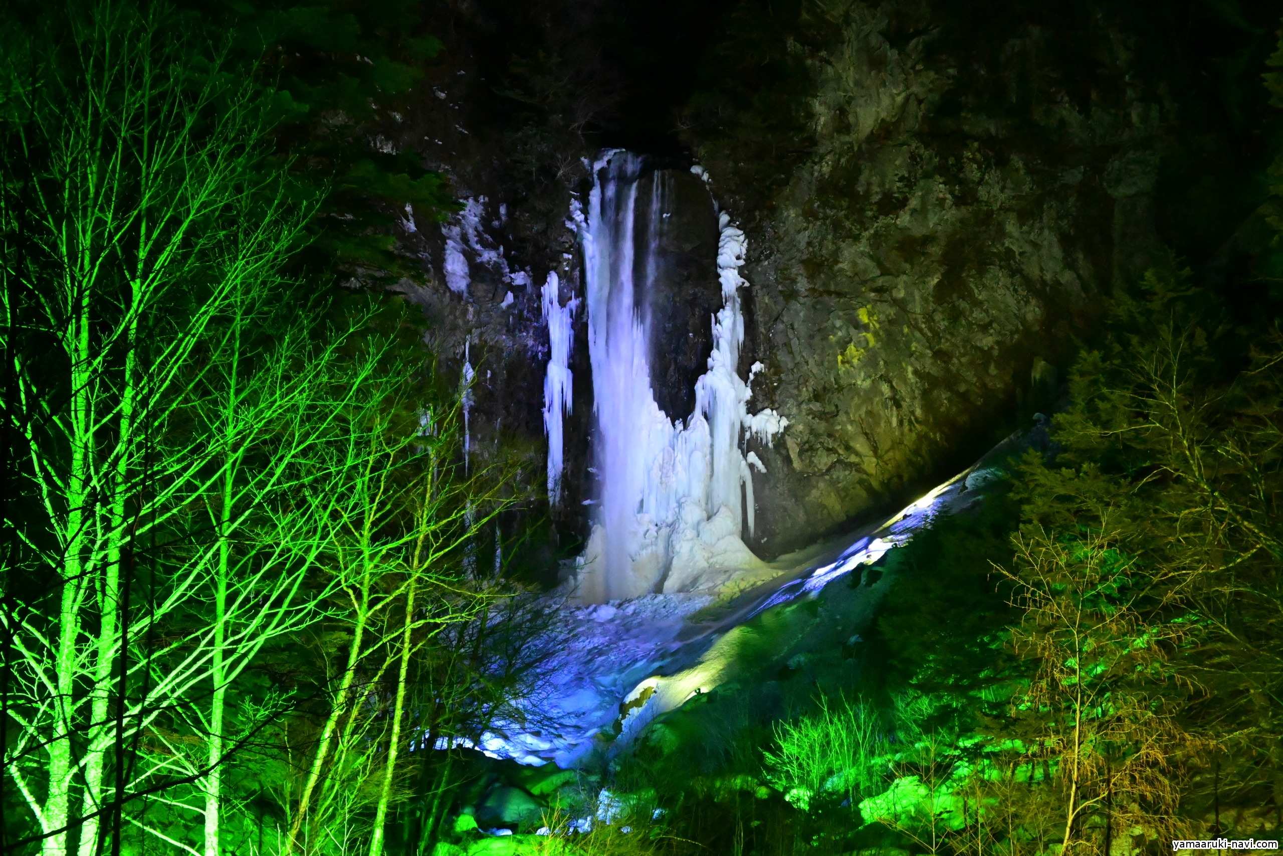 日本の滝百選に名を連ねる平湯大滝(高さ64m 幅6m)の厳冬によって作られた巨大な氷柱をライトアップ。